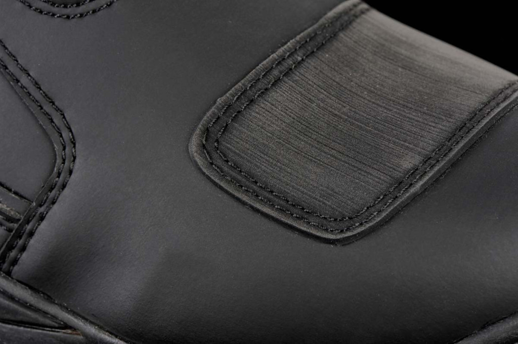 Nou-venit în gamă, ghetele GT D3O® WP își propun să consolideze locul Furygan pe piața încălțămintei pentru motociclete. Pregătite să reziste celor mai dificile condiții, aceste ghete nu te vor dezamăgi niciodată. - O zonă mare de elasticitate între picior și gleznă permite ghetei să rămână flexibilă și confortabilă la mers și la condus pentru perioade lungi de timp. Piele sintetică PU. Poliuretan. Cauciuc. Părțile din cauciuc oferă o aderență bună datorită unui strat antiderapant unic. Microfibră sintetică. Mai subțire decât un fir de mătase, fibra sintetică hidrofugă din care este fabricată această țesătură oferă confort, ventilație și durabilitate de neegalat. Protecție schimbător de viteze. Fermoar lateral. Facilitează încălțarea și menține șireturile la locul lor pentru o potrivire uniformă. Membrană impermeabilă și respirabilă. 47% poliuretan; 33% piele; 15% nailon; 5% cauciuc