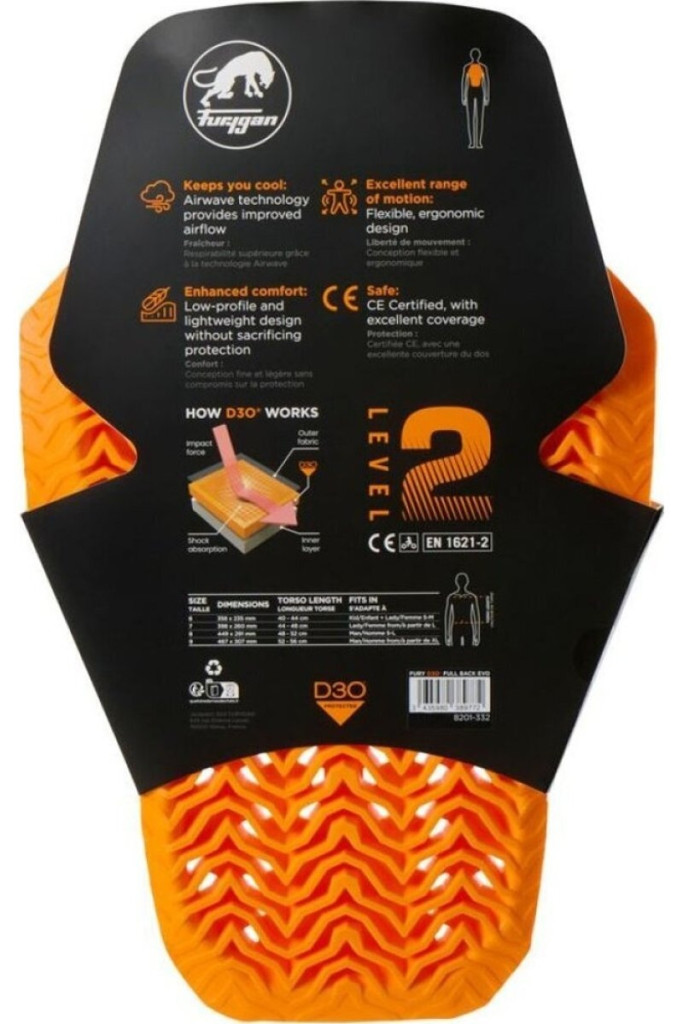 Full Back Fury D3O® Evo este protectorul de spate de vârf de gamă de la Furygan, oferind cel mai înalt nivel de protecție disponibil. Este conceput pentru a se potrivi în orice geacă Furygan și, datorită materialului revoluționar utilizat, oferă un confort de neegalat.