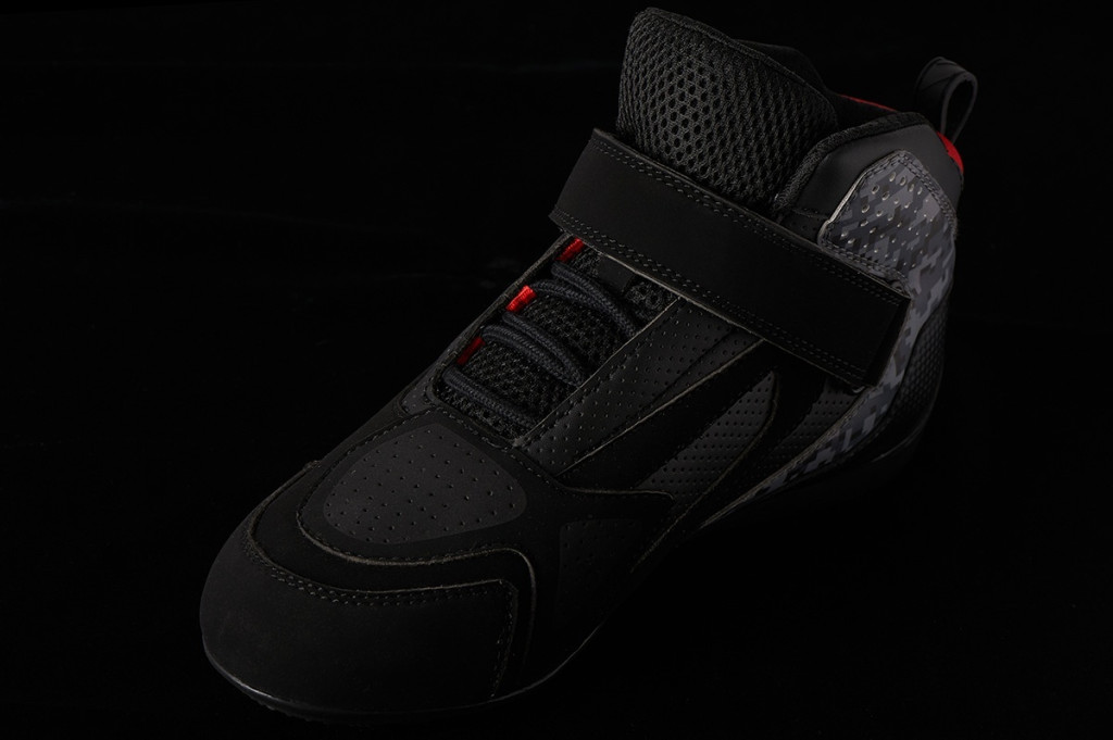 Cu pantofii V4 Vented, Furygan își arată dorința de a oferi un pantof confortabil, ventilat, omologat CE, cu un aspect urban și sportiv, accesibil unui număr cât mai mare de persoane. - O clapă în spatele călcâiului facilitează încălțarea. Piele sintetică PU. Poliuretan. Cauciuc. Părțile din cauciuc oferă o aderență bună datorită unui strat antiderapant unic. Microfibră sintetică. Mai subțire decât un fir de mătase, fibra sintetică hidrofugă din care este fabricată această țesătură oferă confort, ventilație și durabilitate de neegalat. Protecție schimbător de viteze. Brant interior detașabil. Panouri laterale și limbă perforate. Pentru a facilita o bună ventilație a pantofului. 70% poliuretan; 30% poliamidă